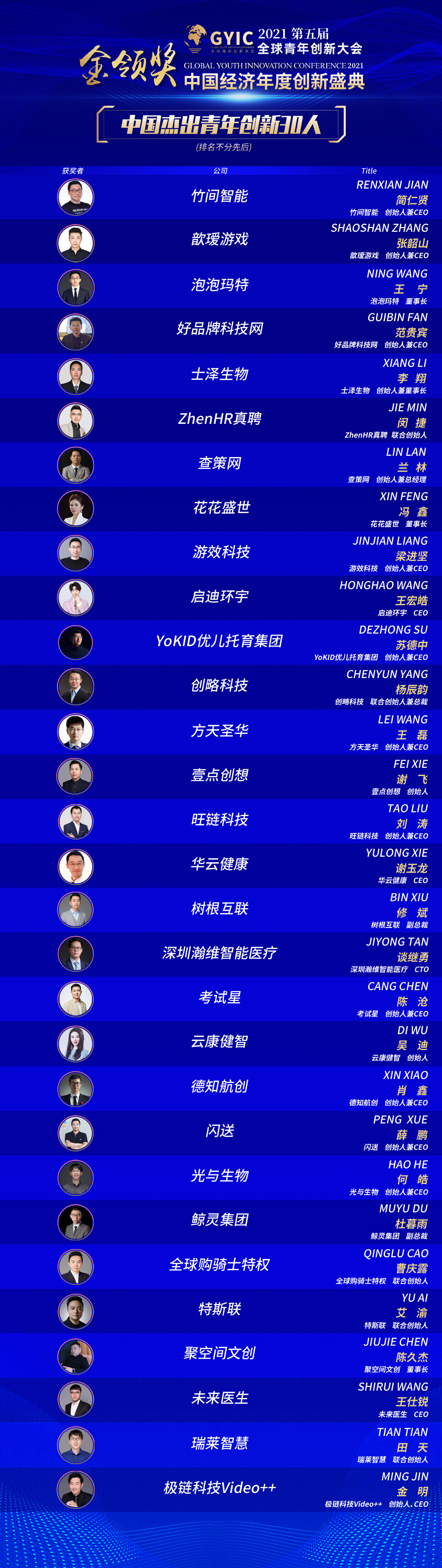 《中国杰出青年创新30人》旨在表彰中国新经济领域涌现出来的敢于开拓、勇于创新的杰出青年领袖;他们带领团队以新技术,新产品,新方案和新创意为所在行业注入了新活力。出门问问创始人兼CEO李志飞、竹间智能创始人兼CEO简仁贤、歆瑷游创始人兼CEO戏张韶山、查策网创始人兼总经理兰林、好品牌科技网创始人兼CEO范贵宾、士泽生物创始人兼董事长李翔、ZhenHR真聘创始合伙人闵捷、花花盛世董事长冯鑫、游效科技创始人兼CEO梁进坚、启迪环宇CEO王宏皓、瑞莱智慧联合创始人田天、极链科技Video++创始人兼CEO金明、YoKID优儿托育集团创始人兼CEO苏德中、创略科技联合创始人兼总裁杨辰韵、旺链科技创始人兼CEO刘涛、壹点创想创始人谢飞、方天圣华创始人兼CEO王磊、华云健康CEO谢玉龙、树根互联副总裁修斌、 深圳瀚维智能医疗CTO谈继勇、考试星创始人兼CEO陈沧、云康健智创始人吴迪、德知航创创始人兼CEO肖鑫、闪送创始人创始人兼CEO薛鹏、光与生物创始人兼CEO何皓、鲸灵集团副总裁杜暮雨、全球购骑士特权联合创始人曹庆露、聚空间文创董事长陈久杰、集奥聚合创始人崔晶晶等30位优秀青年企业领袖入选。