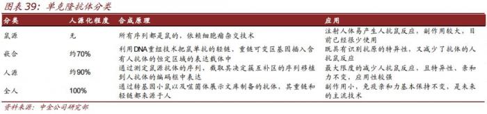 另据中金公司分析,相较其他原理,通过转基因小鼠以及噬菌体展示文库制备的抗体,其重链和轻链都来源于人,副作用小,免疫亲和力基本保持不变,是未来的主流技术。